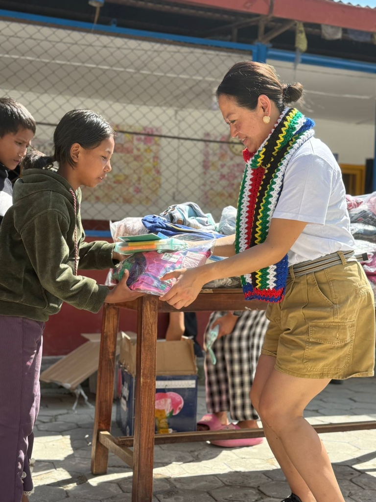 After descending from the world’s highest peak, Angela and her Sherpa team travelled to the Rolwaling Sangag Choling Monastery School and the Mountain Children Home, where they personally delivered the items donated by supporters from across the globe.