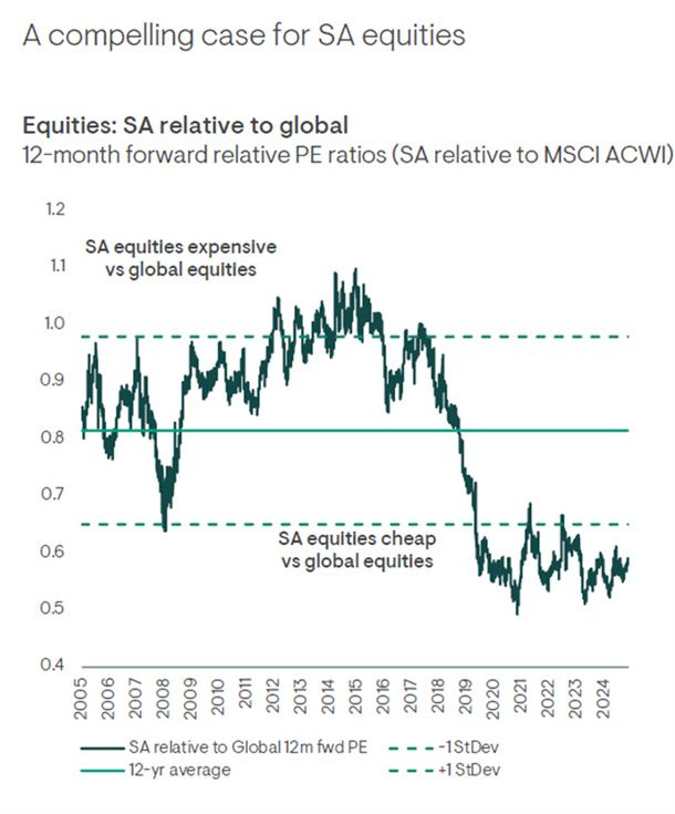 Local markets have responded positively. Despite a strong 22% return in 2025 (excluding resources), South African equities continue to trade on forward price‑to‑earnings ratios below their 12‑year average and at a meaningful discount to global markets. This suggests further upside if reforms continue and global conditions remain supportive.